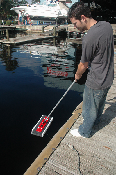 Floating design and pivoting handle make water surface clean-up easy with no stray oil pads to retrieve.