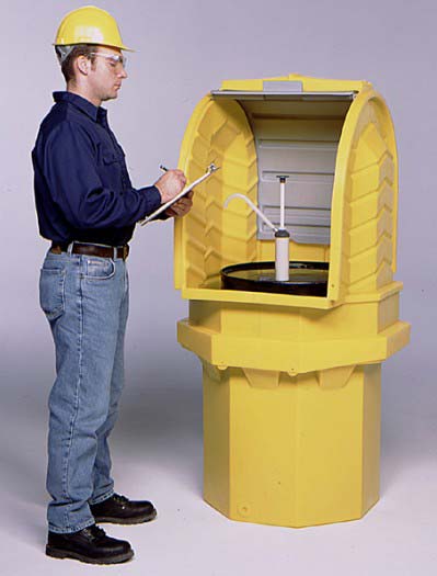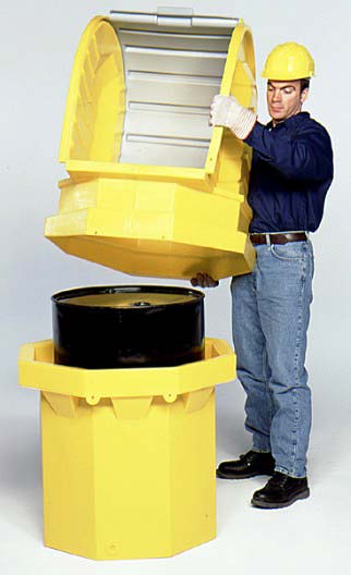 This two-piece spill containment unit provides safe and secure outdoor storage for your 55-gallon drum. Simply use your forklift and/or drum handling equipment to lift and lower the drum into the bottom sump, then place the top portion over the drum where it locks in place onto the lower sump portion. Once assembled with the drum in place, access is quick and easy via the roll top door. The top Hard Top section does not need to be removed again unless the drum needs to be replaced.