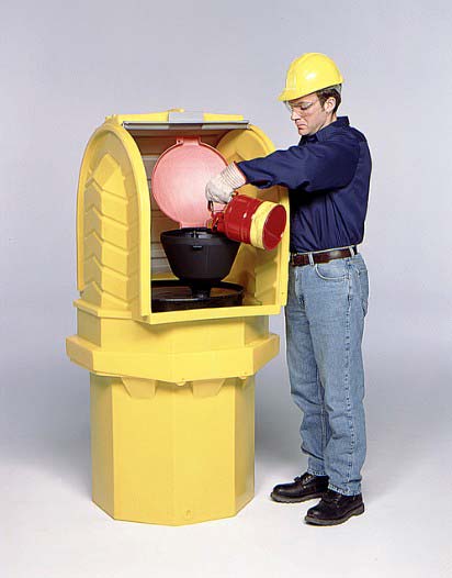 • Low profile (8 3/4") containment pallet positions drum-top funnels at a safe, convenient level to pour hazardous wastes.