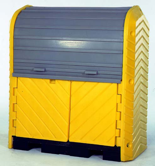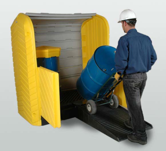 The Ultra-Hard Top Plus Spill Pallet provides a safe, convenient and effective place to store (1) or (2) 55-gallon drums. The roll-top doors above and swing out doors below provide complete and easy access to the inside spill containment area. Simply place your drums inside of the unit with your drum handling equipment or with our optional ramp. Close the doors and you are done. Your drums are protected from the elements and unauthorized access (the unit can be locked) and your property is protected from spills or leaks.